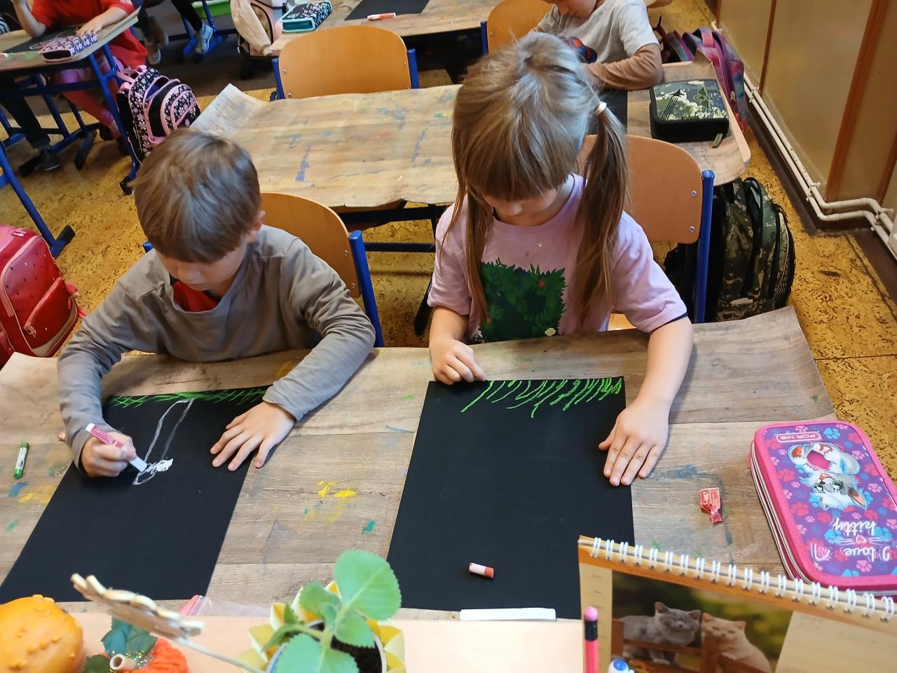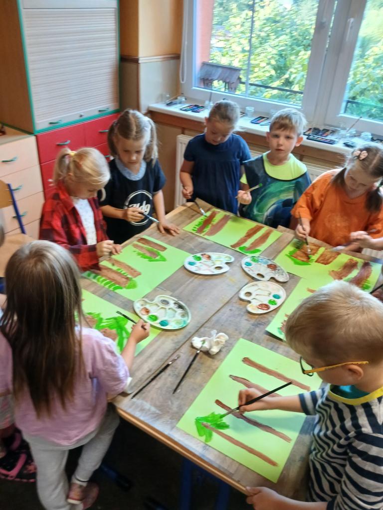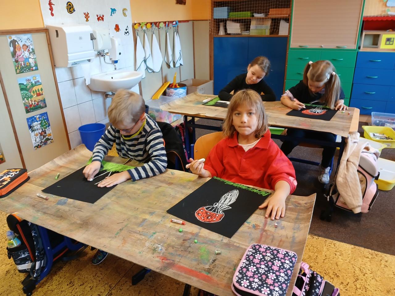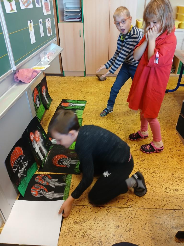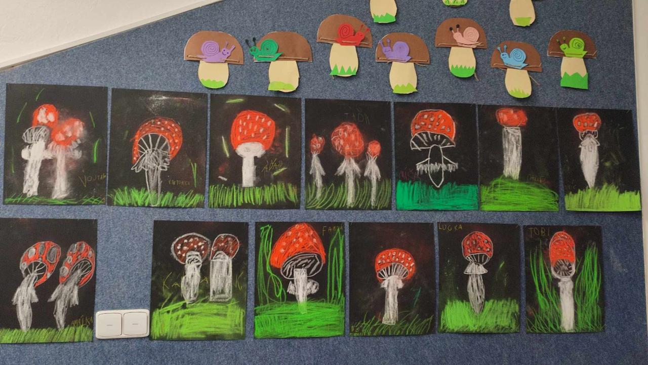 Prvňáčci byli při výtvarné výchově a pracovních činnostech velmi tvořiví! V září malovali ježka, vyráběli lišku v lese. Začátkem října namalovali krásné muchomůrky.
